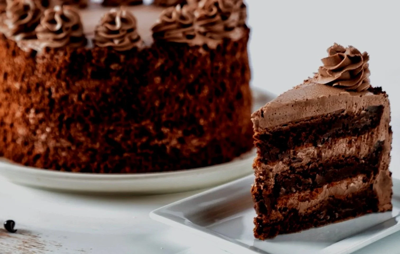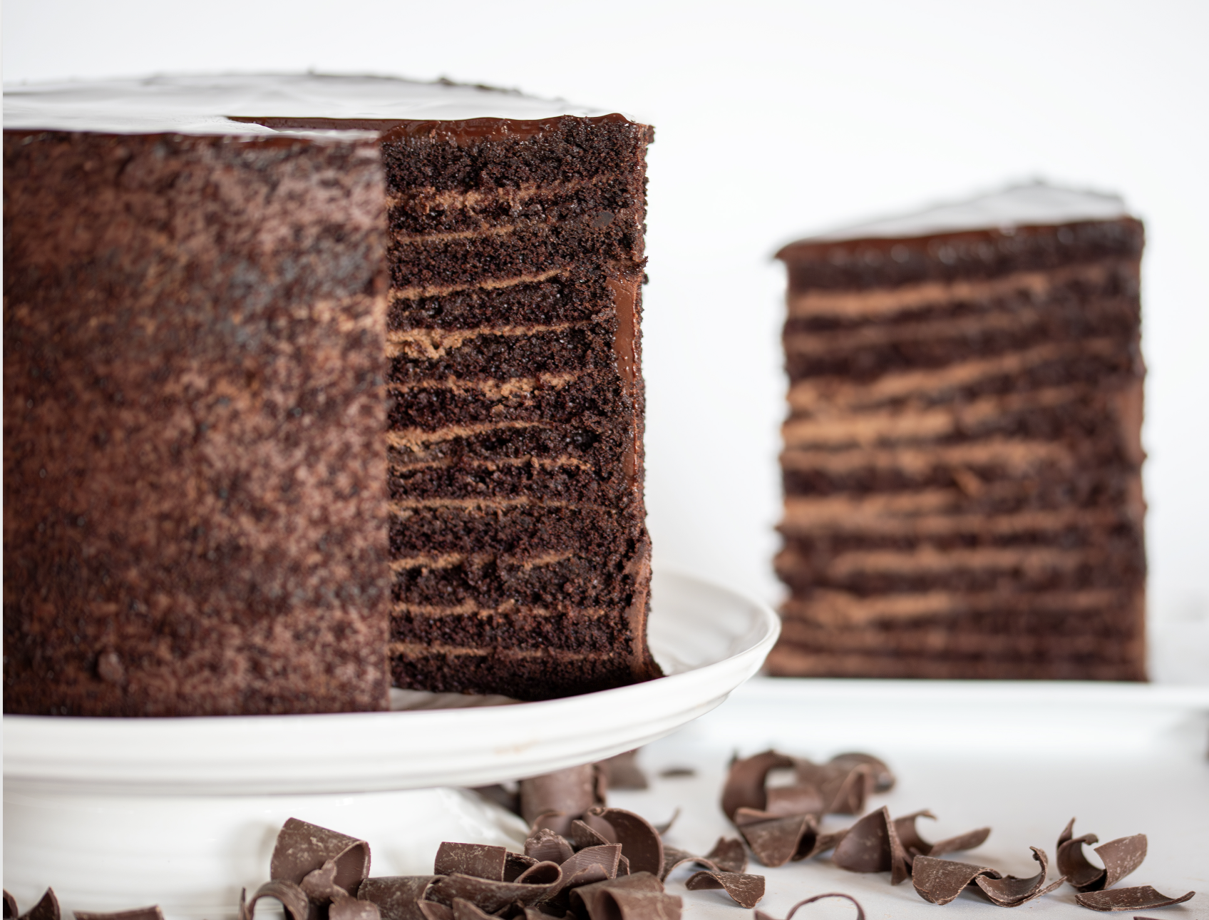 12 layers of dark chocolate torta, 11 layers of chocolate custard, fudge sauce, 1 layer of french semisweet chocolate ganache