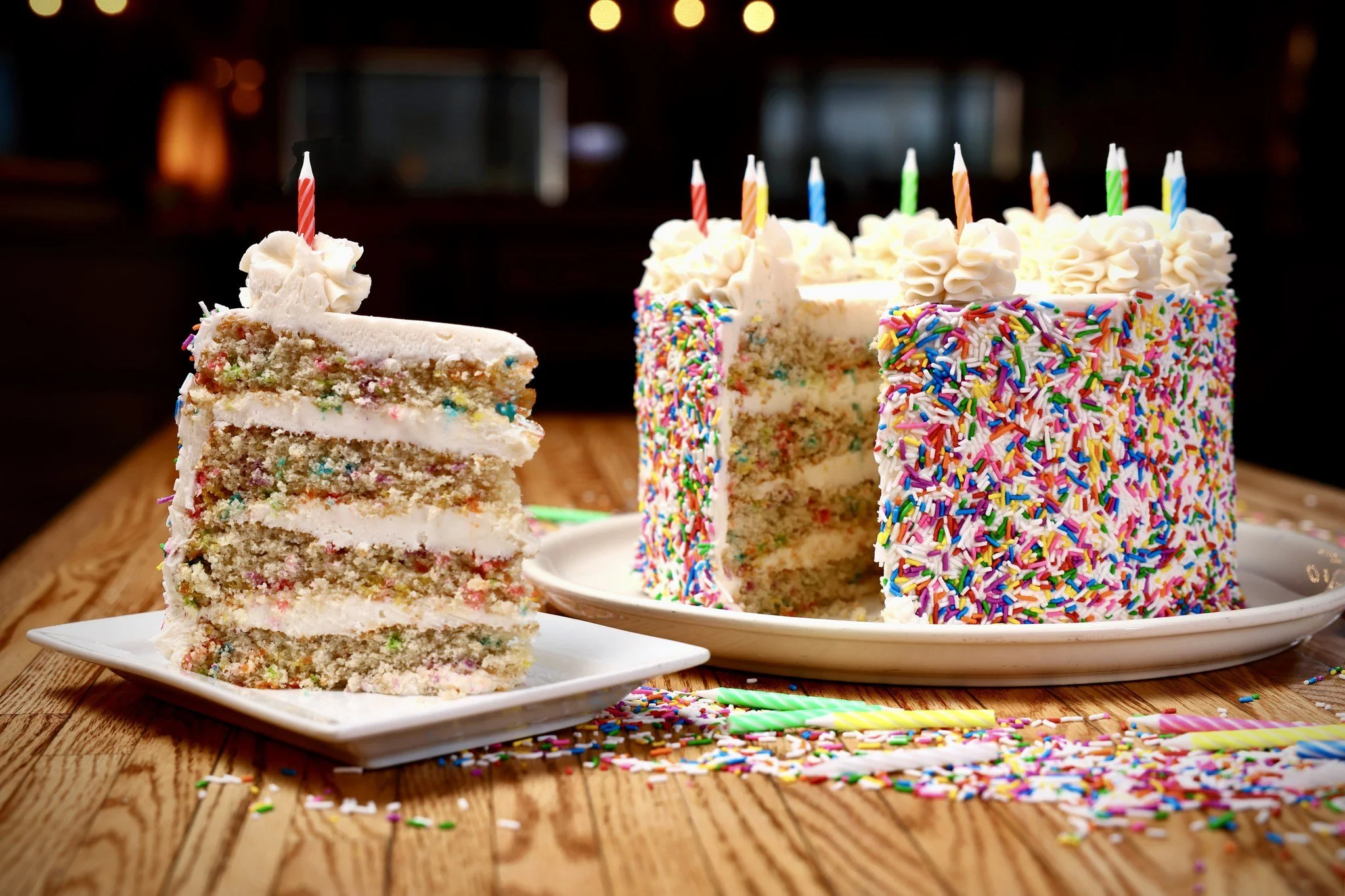 layers of buttery confetti vanilla cake, vanilla frosting, rainbow sprinkles